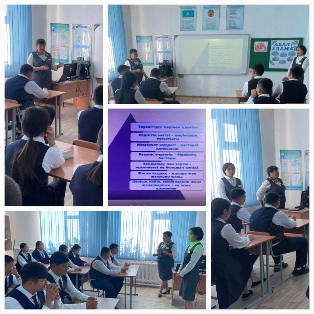 Оқу жылының алғашқы күнінде 9 – 11-сыныптарда «Менің Отаным – Қазақстан» тақырыбында тәрбие сағаты өткізілді. Отанымыздың тарихы мен бүгініне тоқталып, оқушылардың туған жеріне, еліне деген сүйіспеншіліктері жайында ой қозғалды. Адал азаматтың тұлғасы жайында...