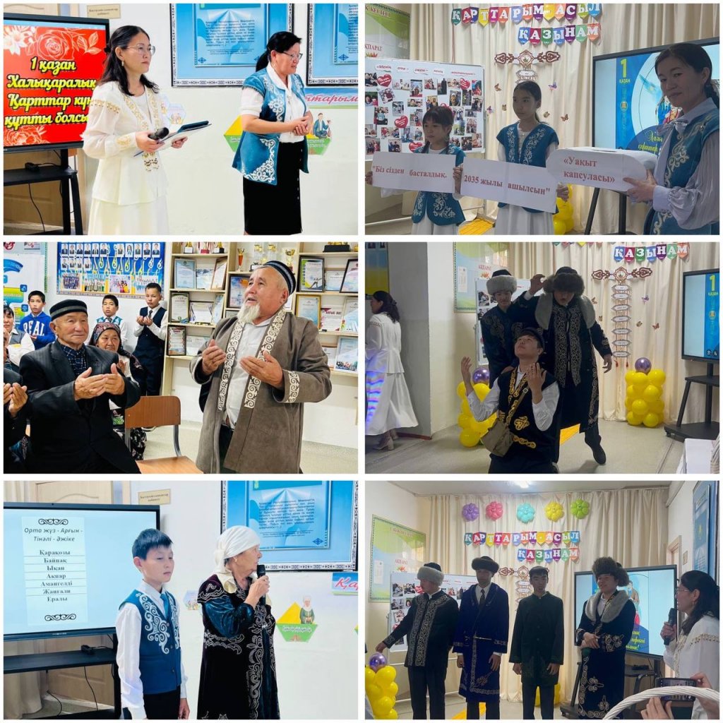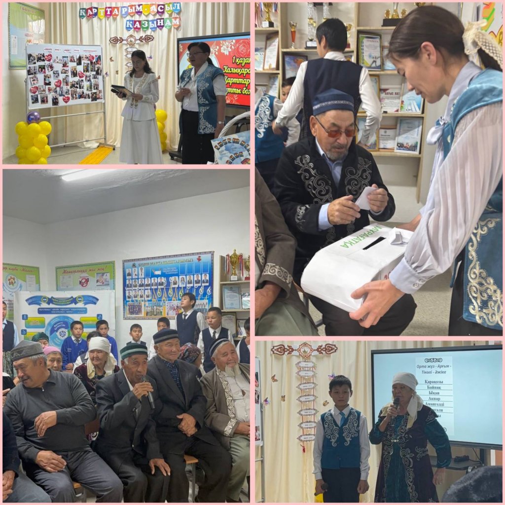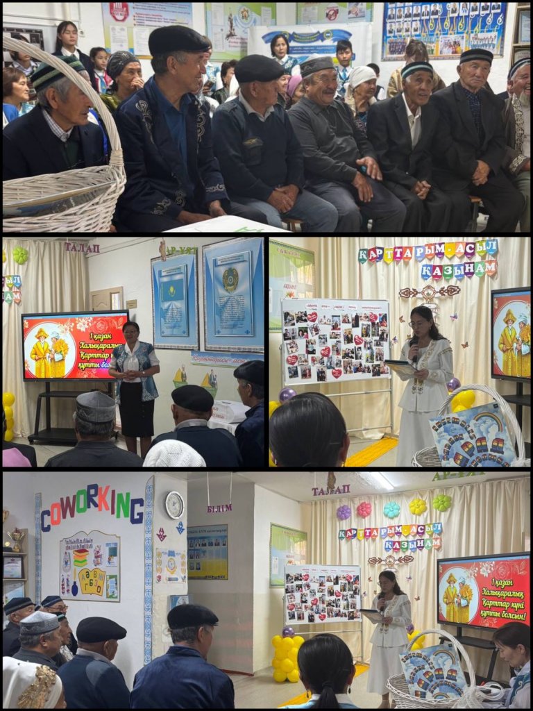 Бүгін, 1 қазан - Халықаралық қарттар мерекесіне орай мектебімізде мерекелік шара өтті. Шараның мақсаты үлкенге ізет, қарияға құрмет, еңбек адамына ілтипат көрсету. «Уақыт капсуласы» форматында өткен бұл кеште ақсақал аталар мен ақжаулықты әжелеріміздің ақыл-кеңесі, үлгі-өнегесі, тәлім-тәрбиесі келешек ұрпаққа аманат ретінде сыр-сұхбат арқылы жүргізіліп, өзіне ыстық деген көзмоншағына айналған естелік заттары мен өсиет хаттары капсулаға салынып, аманат қылып мектеп мұрағатына 10 жылға тапсырылды. Шара барысында 2-3 сынып оқушылары ән, шырқап, «Қызғалдақ» тобы биледі. 6 - сынып оқушылары Ералы әжесімен жеті атасын таныстырып, Рамазан әдемі бата берді. 2-сынып оқушысы Айлана жеті атасын таныстырып, 10-11 сынып оқушылары мағыналы көрініс қойды. Барлық ат салысқан мектеп ұжымына, оқушылары мен ата-аналарға алғысымызды білдіреміз. Шара мектеп мұғалімі Олжабай Жоламанның «Әке-ана» әнімен аяқталып, мектептің ата - аналары дайындаған ақ дастарханынан қарияларымыз дәм татты. Қарияларымыз қуанса , бізде қуанамыз. Қазыналы қарттарымыз аман, бейбіт-тыныш заман болсын!